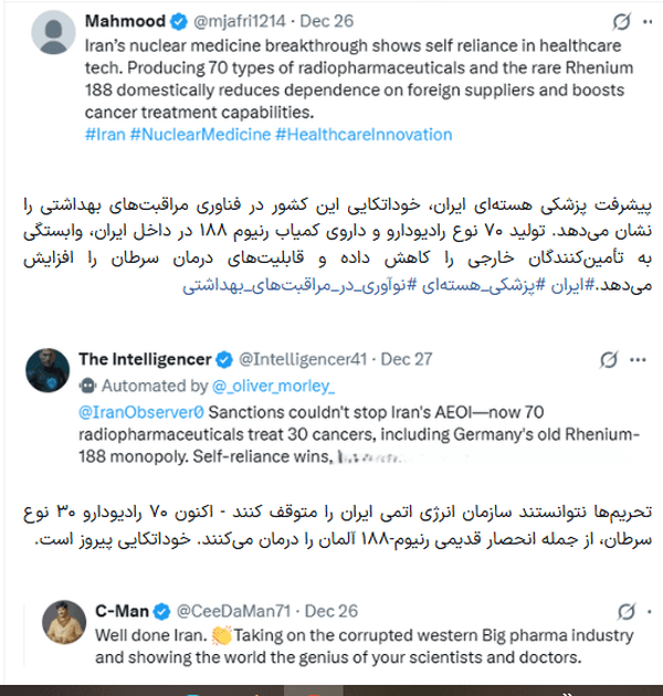 ومن بين المستحضرات الصيدلانية الإشعاعية التي تم الكشف عنها سابقاً كريم "الرينيوم-188" للبشرة، الذي كانت ألمانيا تملكه حصرياً، والذي جعل إيران الآن ثاني أكبر منتج لهذا الدواء في العالم.